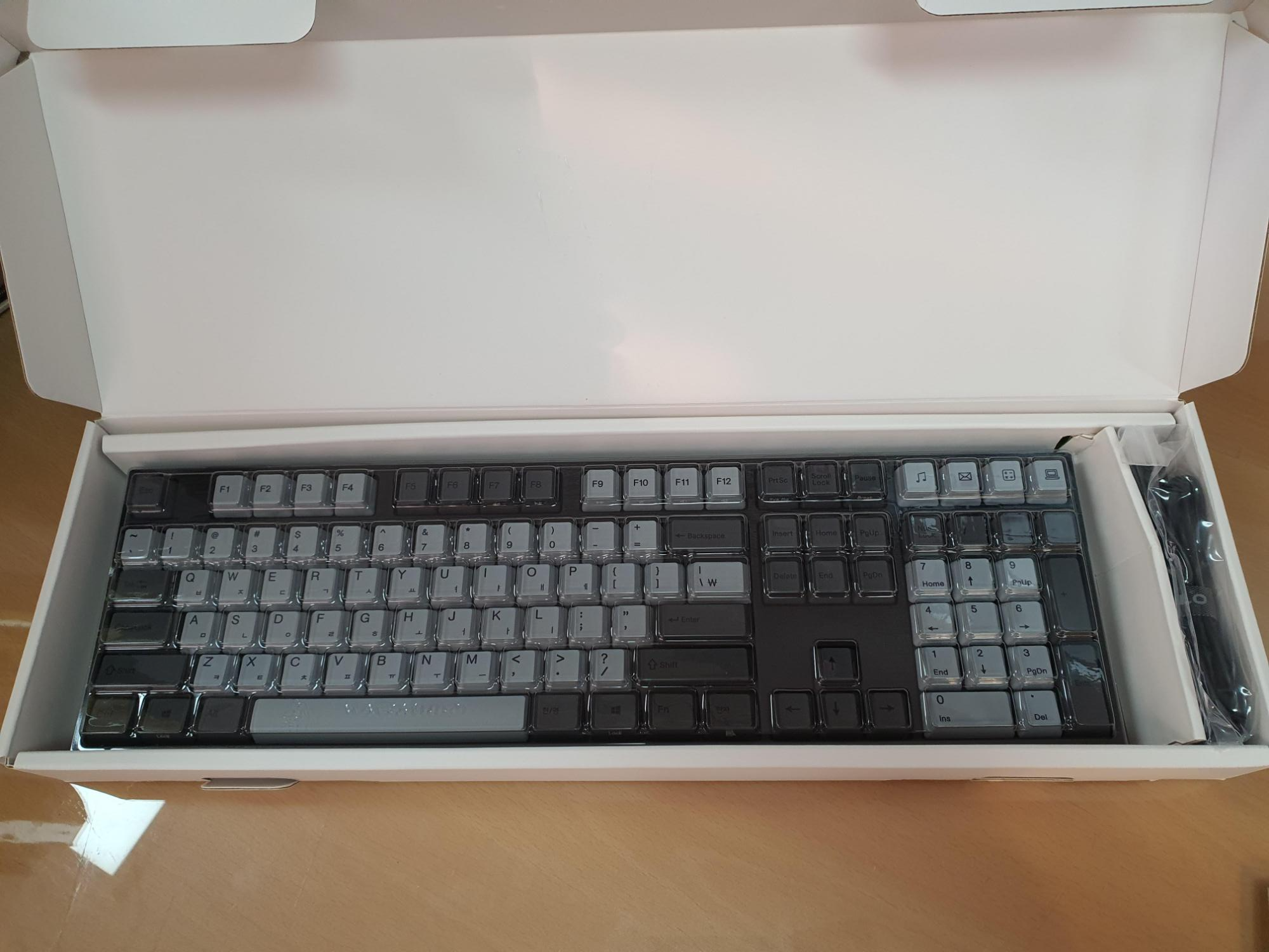 박스 안쪽은 이렇게 되어 있다. 사실 저 키캡보호판 밑에 하얀색 종이로 키보드를 감싸놓았지만 너무 흥분한 나머지 그걸 찢어 버렸고 아차 싶어서 다시 찍었다. 일단 밖의 화려한 모습과는 달리 안쪽 패키징은 그냥 그렇다.
