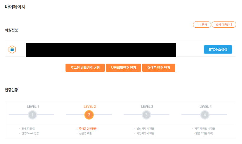 1단계의 경우에는 휴대폰이나 이메일을 통한 인증만 있으면 되고, 2단계의 경우에는 휴대폰 본인인증만으로 거래가 가능한 상태가 됩니다.