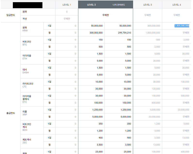 각 단계에 따라 출금한도가 나눠져 있습니다. 2단계부터는 입금한도는 무제한이지만 출금한도는 나눠져 있습니다. 만약 본인이 2단계라면 한 번 출금하는데 5천만원만 출금할 수 있습니다(사실 코인으로 5천만원 버는것이 쉽지 않기 때문에 초보자라면 출금한도가 5천만원이여도 다 못채운다).