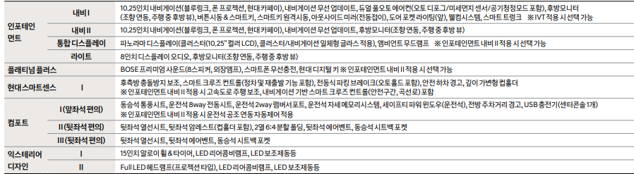 | 컴포트1(모던부터) | 동승석 통풍시트 | 조수석 통풍시트가 추가됩니다(모던등급은 운전석만 통풍시트가 들어갑니다) |