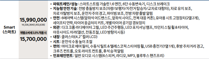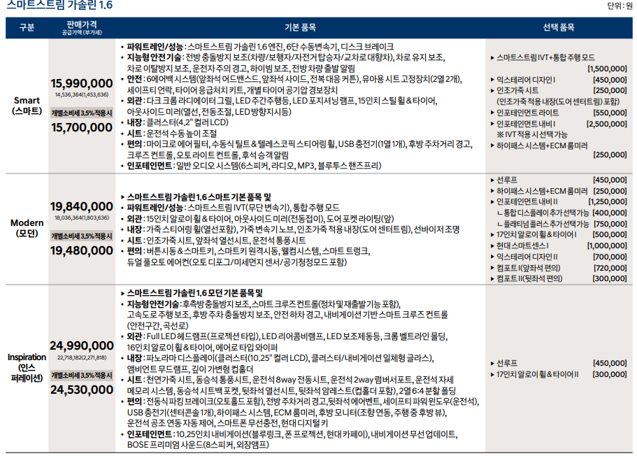 게다가 깡통인 스마트 등급은 개소세 적용시 1,570만원부터 시작합니다. 정말 잘 나가는 차 치고는 굉장히 저렴한 것을 볼 수 있습니다.