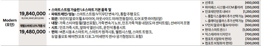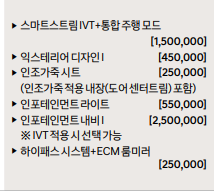 모던에서 선택할 수 있는 옵션은 총 6개 품목입니다(스마트스트림 IVT를 빼면 5개 품목)
