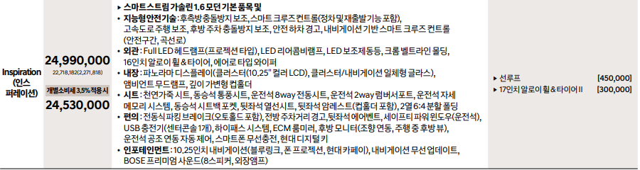 추천 옵션 : 인포테인먼트 내비2 + 현대스마트센스 / 총가격 : 22,090,000(보험, 취등록세 포함시 약 2,400~2,500만원