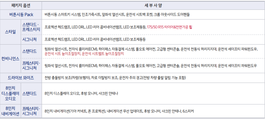 옵션은 다음과 같습니다. 사실 어려운말들이 많아서 뭐가 뭔지 보르지만 저는 일단 스탠다드 등급을 산다면 버튼시동 팩, 드라이브 와이즈, 8인치 내비게이션을 추천드립니다. 일단 같이 알아볼까요?