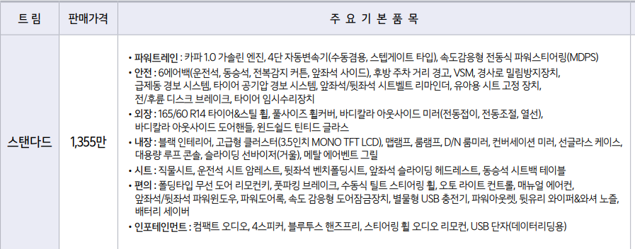 일단 기본적인 트림별 가격표와 기본옵션(주요기본품목)입니다.