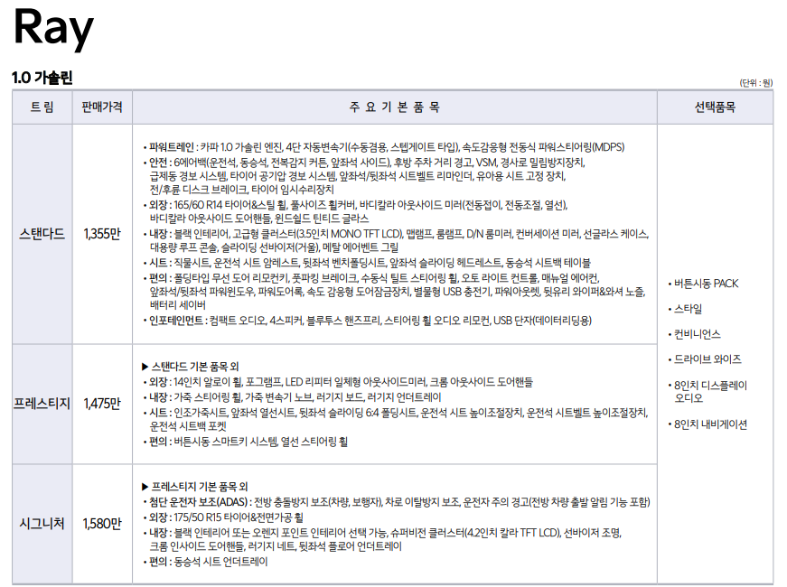 안녕하세요 오늘은 레이의 트림과 옵션에 대해서 같이 알아보고자 합니다.
