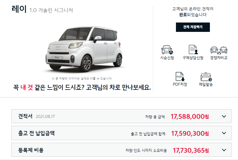 스탠다드, 즉 깡통입니다. 가격은 1,355만원부터 시작합니다. 아반떼 k3보다 한 등급 아래지만 가격 심리 저항선에는 미치지 못하는 가격입니다. 각 종 비용을 합쳐 약 1,369만원 정도 나오게 됩니다. 확실히 경차는 등록제 비용이 저렴합니다.