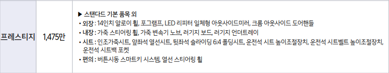 - 프레스티지 : 1,475만원 시작(풀옵션 시 17,500,000원)