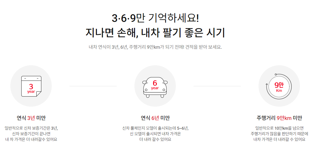 무척 빠르고 간편한 방법이며 발품을 팔지 않더라도 적당한 시세를 제시하기 때문에 차량 판매에 어려움이 없습니다. 물론 그 적당한 시세를 제시하지 않는 차량 평가사들도 존재하고 기업 또한 이윤 극대화를 추구하기 때문에 사전에 내 차량의 시세를 조사할 필요는 있습니다.