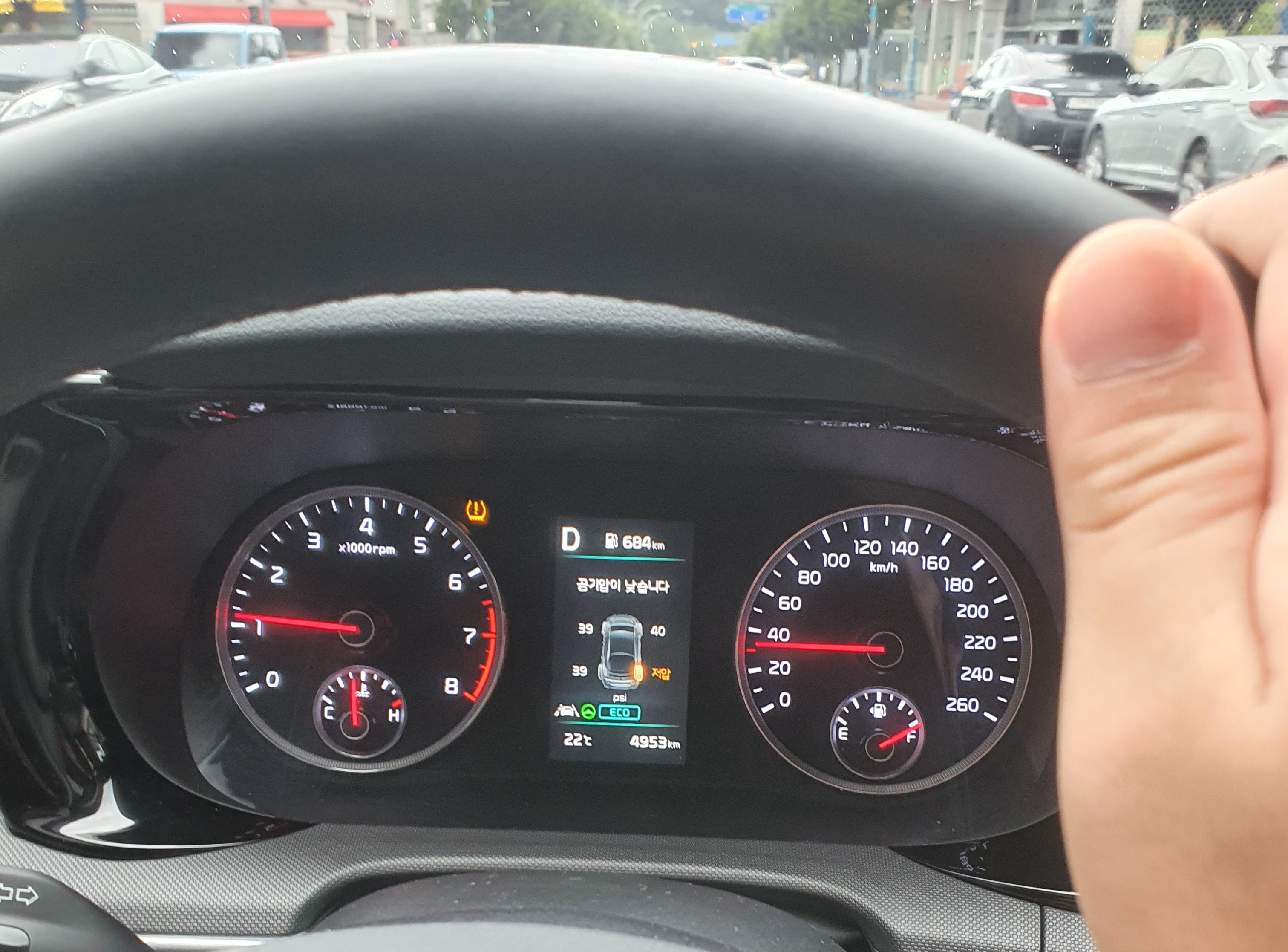 사진에서는 공기압에 문제가 있는 것으로 나타납니다. 물론 공기압에 문제가 있다면 다시 공기압을 채우거나 타이어에 펑크가 났는지 확인하여 조취를 취하면 되기 때문에 큰 문제는 아닙니다.