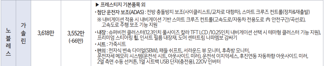노블레스는 프레스티지와 비교하여 3백만원이 추가된 금액입니다. 어마어마한 차이가 있습니다. 프레스티지에서 노블레스로 트림을 올릴 경우 얻을 수 있는 기본 품목들은 다음과 같습니다.