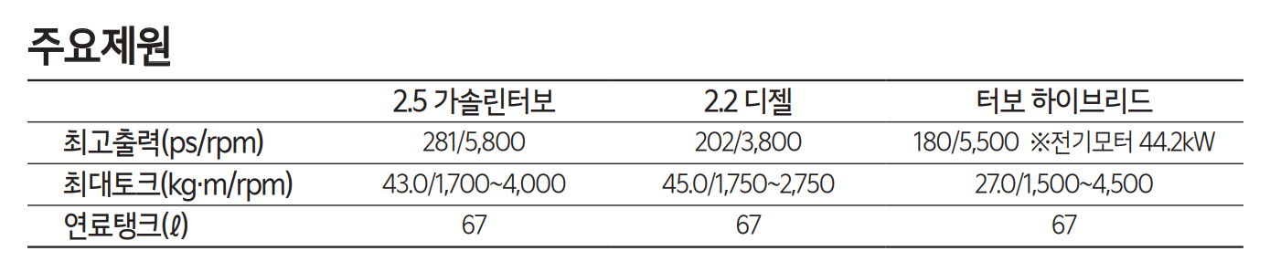 엔진 | 각각 2.5 터보 엔진 / 2.2 디젤엔진이 들어갑니다. 제원상 터보 엔진이 더 큰 출력을 내게 됩니다만, 그럼에도 연비와 기름값이 무섭다면 디젤을 선택하는게 더 좋은 선택이 되겠습니다. 다만 디젤의 경우 예열이나 DPF 클리닝과 같이 더 많은 신경을 써줘야겠습니다. |