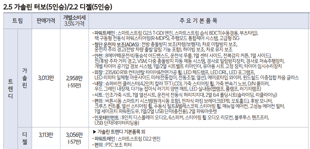 먼저 트렌드 등급입니다. 가격은 가솔린 모델이 3,013만원 / 디젤 모델이 3,113만원으로 시작합니다.