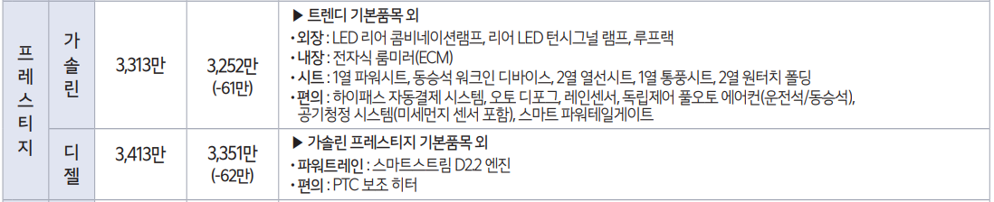 혼자타게 된다면 추천드리는 것은 2.2디젤 프레스티지 등급을 추천드립니다.