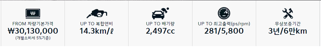 최고 출력이 281/5,800rpm으로 나와 있습니다. 여기서 281은 차량의 마력을 뜻하며 5,800은 RPM을 뜻합니다. 이는 휘발유 모델인 가솔린 2.5 터보 버전을 택했을 때 나오는 출력이며 디젤을 선택할 경우 202마력, 3,800RPM으로 내려가게 됩니다.