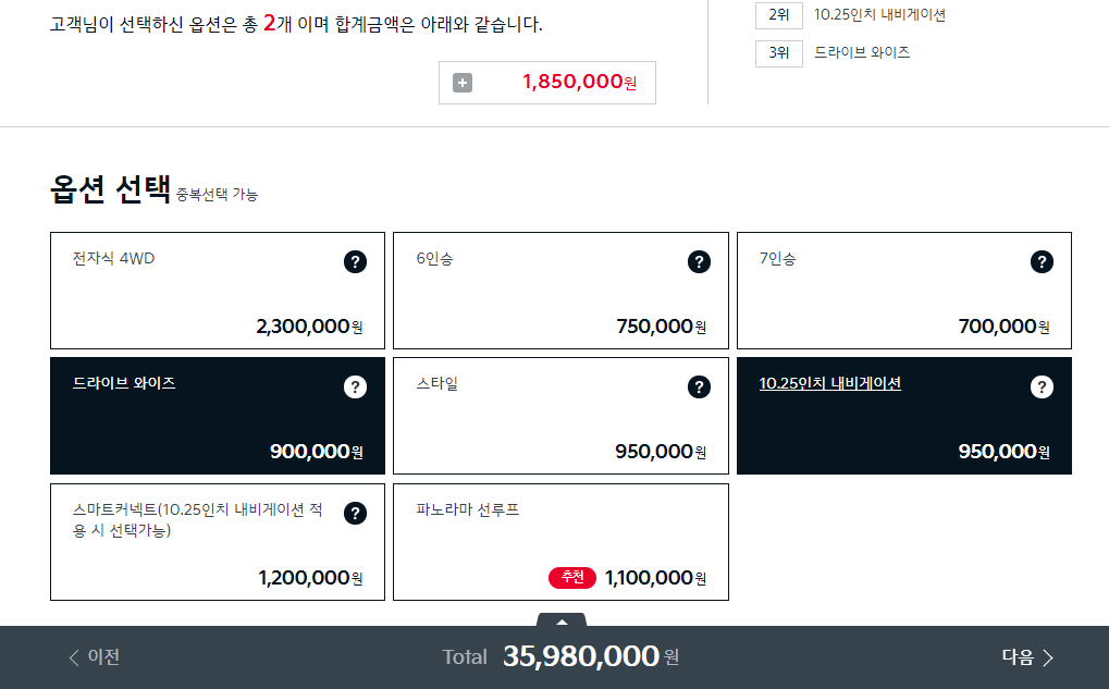 제가 추천드리는 옵션은 "드라이브 와이즈" + "10.25인치 내비게이션" 입니다.