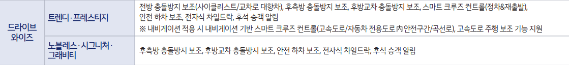 특히 드라이브와이즈의 경우 트렌디, 프레스트 등급에서 드라이브 와이즈를 넣게 되면 죽어도 후측방 충돌방지 보조, 안전하차보조와 같은 옵션을 얻을 수 없습니다. 무조건 상위 트림을 선택해야 얻을 수 있게됩니다. 이건 조금 너무하지 않나 싶습니다.