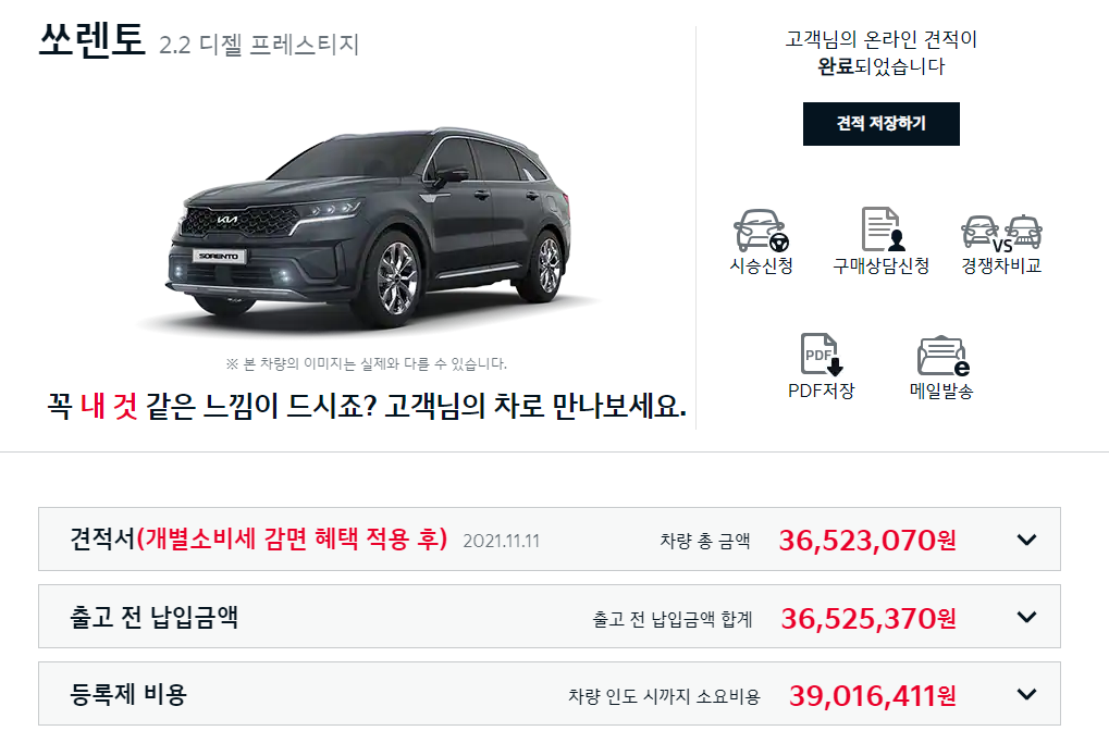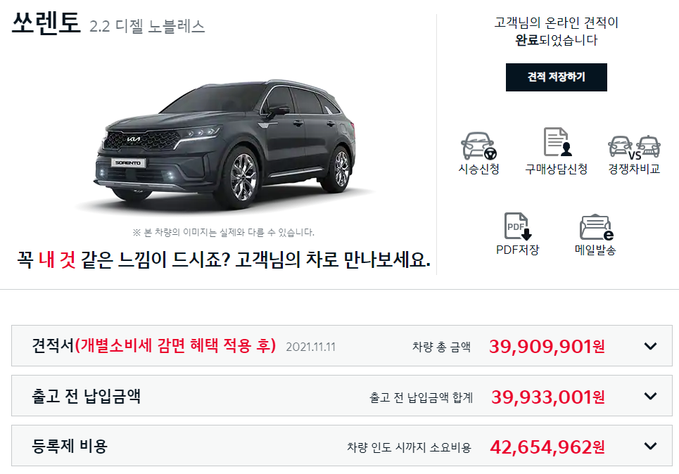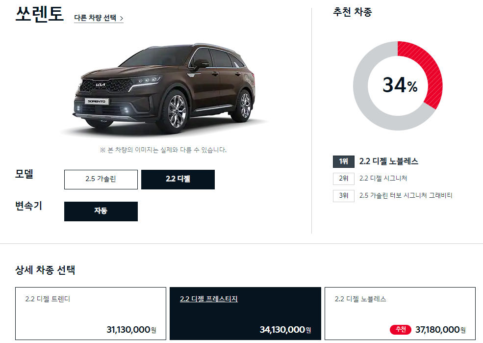 쏘렌토는 기본 차량 가격만 해도 3천만원이 넘는 고가의 차량입니다. 이는 가솔린 버전의 깡통을 선택했을 때의 가격이며 디젤의 경우 여기서 백만원이 더 붙어 3,113만원부터 시작합니다.