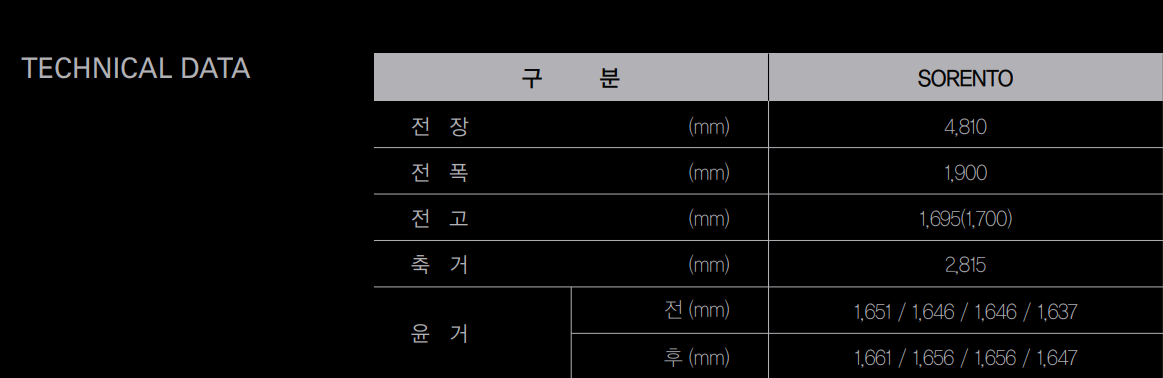 전장은 차량의 앞과 뒤의 끝과 끝을 재보았을 때 나오는 길이입니다. 4,810mm로 경쟁 차종인 현대 산타페가 4,785mm로 약 35mm 큰 전장을 가지고 있습니다.