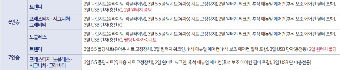 - 1열 파워시트(전동으로 시트 조절), 1열 통풍/열선시트, 2열 열선시트 추가
