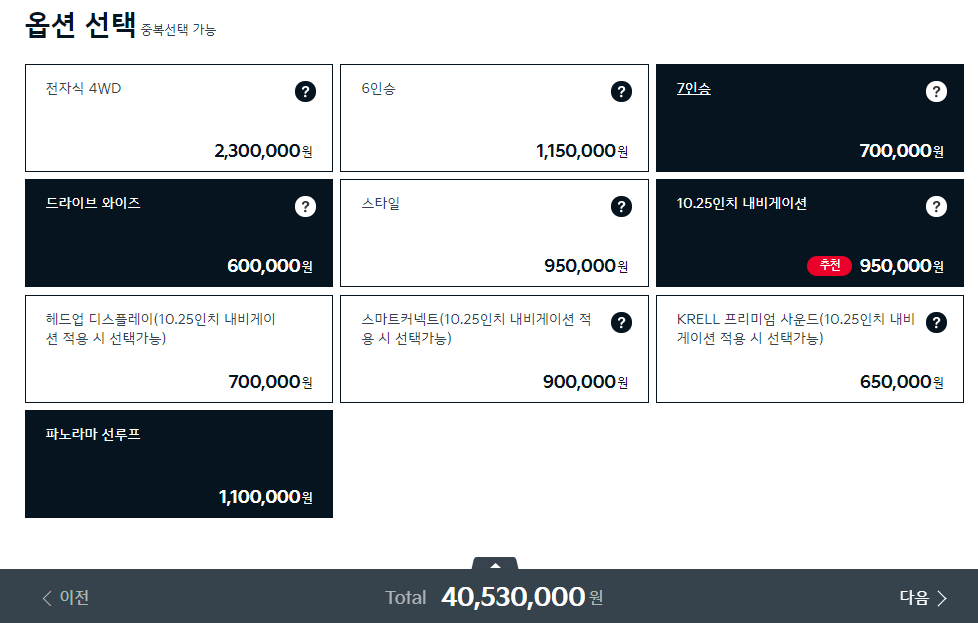 조금 옵션질이 과하다는 점을 먼저 설명드리겠습니다. 각 트림별로 옵션을 선택했을 때 이 옵션을 통해 얻을 수 있는 차량의 기능들이 과히 세분화되어 있습니다.