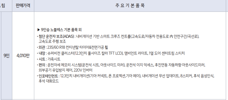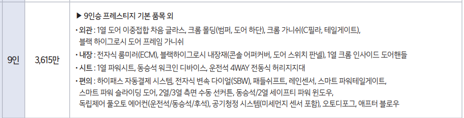 9인승은 7인승과 대빟라여 더 많은 옵션을 기본품목으로 두고 있습니다. 물론 7인승에서 기본품목으로 제공하는 옵션들은 제외됩니다.