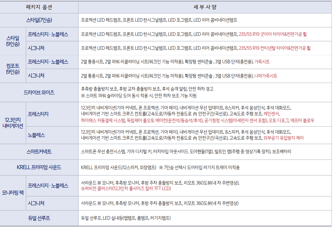 역시 최고 트림이라 그런지 상당히 많은 옵션들이 기본품목으로 제공됩니다. 다만 시그니처 등급을 구입하시더라도 좌석의 편안함을 위한 컴포트 옵션과 외관의 고급화를 위한 스타일 옵션은 별도로 추가해야합니다.