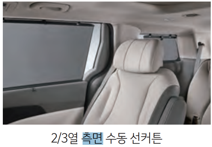 | 2열/3열 측면 수동 선커튼 | ![]() 자동이 아닌 수동으로 2열/3열에서 커튼을 다음과 같이 칠 수 있습니다. |