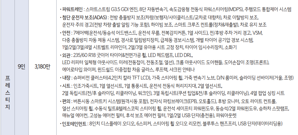 이상으로 프레스티지 버전을 알아봤습니다. 상당히 많은 옵션들을 포함하고 있음에도 불구하고 아쉬운 부분들이 많습니다. 특히 안전에 관한 사항들이 많이 빠져있습니다.