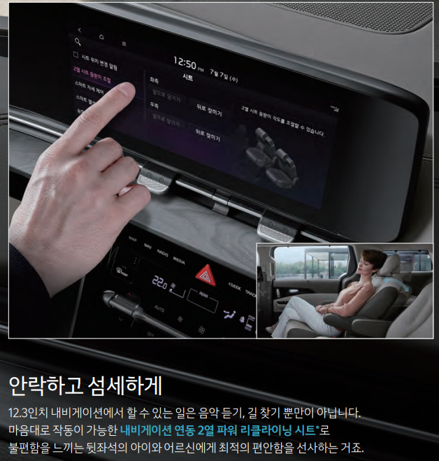 첫 번째, 2열에 좀 더 편안함을 추구합니다. 7인승 모델의 경우 2열 시트에 좀 더 집중된 옵션을 보여줍니다. 기본적으로 시트가 가죽시트로 들어가며 2열에 프리미엄 릴렉션 시트가 기본 품목으로 제공됩니다.