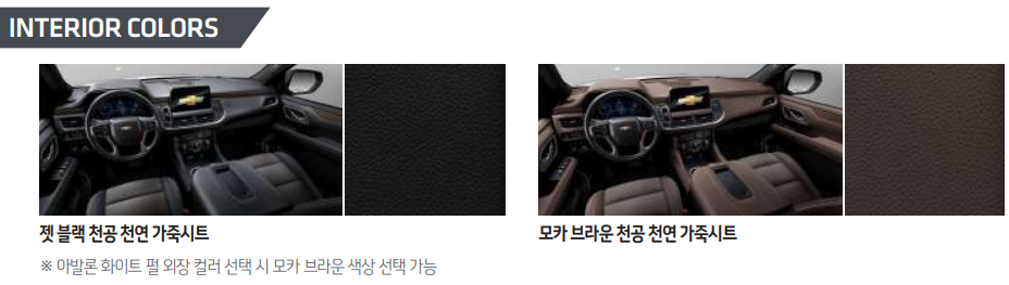 타호의 내관입니다. 쉐보레 한국 홈페이지 방문 시 시트 색은 별도로 변경할 수 없도록 해놨는데 타호의 가격표를 보면 다음과 같이 되어 있습니다.