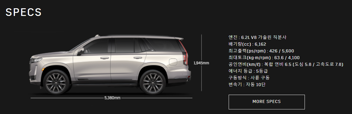 타호의 제원입니다. 상당히 큰 차량임을 수치로만 봐도 알 수 있으며, 실제로 이 차량을 봤을 때에는 그 사이즈에 압도되기도 합니다.