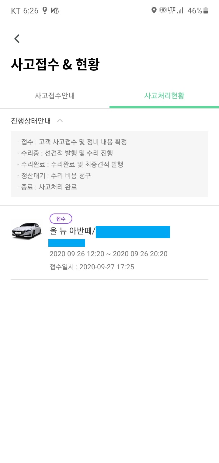 사고 접수에 대한 전화가 끝난 이후에 약 10분후에 카카오톡으로 사고 접수에 대한 알림이 왔습니다.
