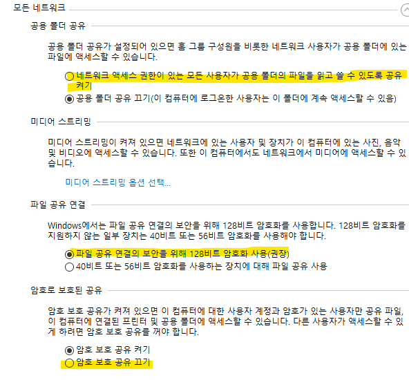 개인, 게스트, 그리고 모든 네트워크에 대한 공유옵션을 볼 수 있는 탭이다. 노란색으로 색칠해 둔 부분을 체크해준다.