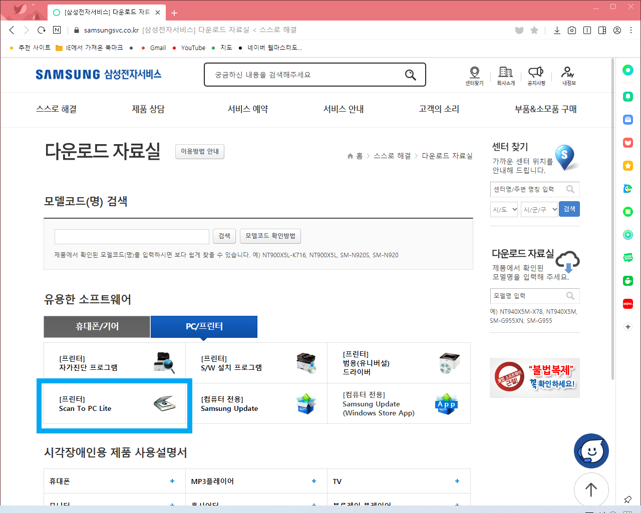 그곳에서 PC/프린터를 누르면 Scan To PC Lite 글과 아이콘이 보이니 다운로드 받아줍니다.