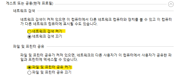 단, 개인과 게스트의 경우에는 복합기 연결과 직접적인 연관이 없을 수는 있으나, 후에 네트워크 공유폴더나 내 PC에 연결된 프린터를 다른 사람들과 공유하기 위해서 켜두는 것을 추천한다.(그렇지 않다면 굳이 켜둘 필요 없다)