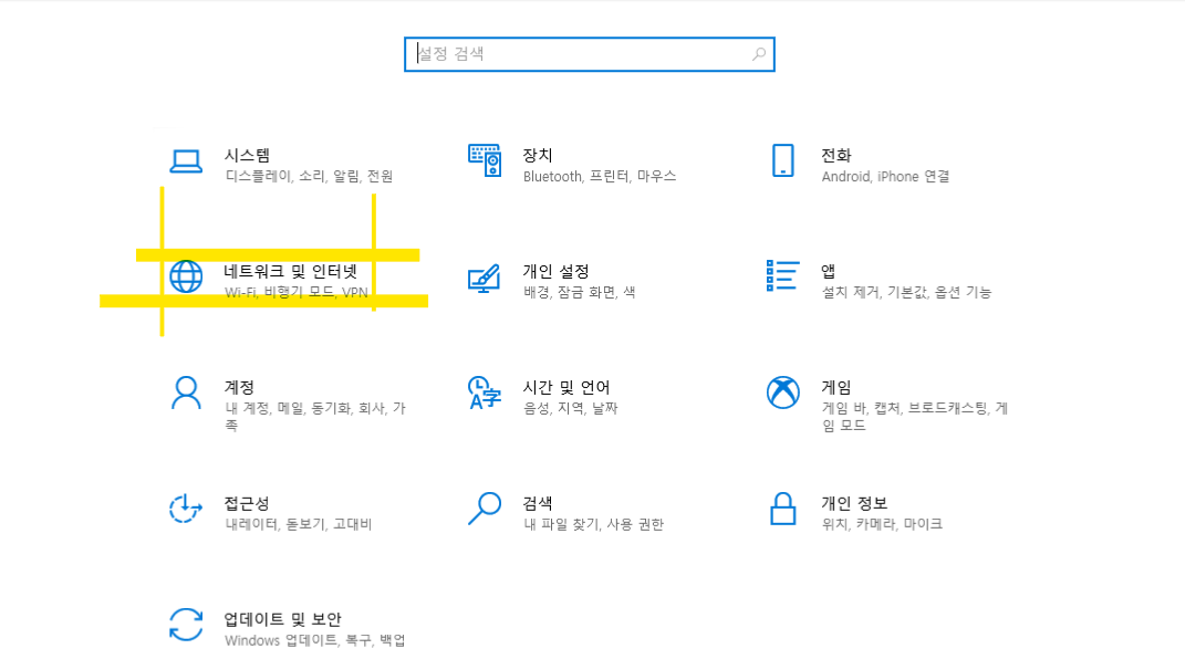 노란색 형관펜으로 색칠해든 네트워크 및 인터넷을 들어갑니다.