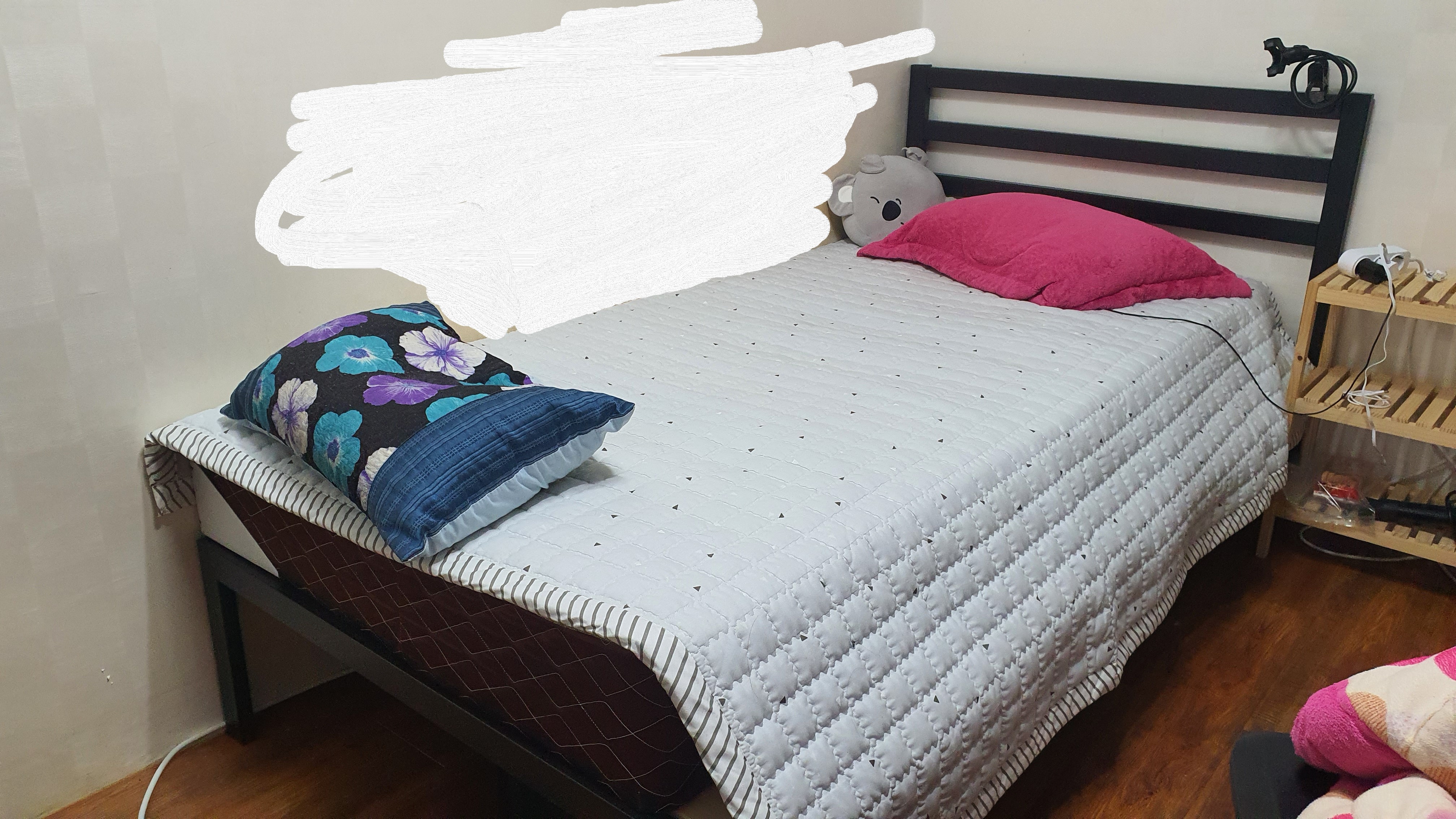 현재 사용중인 모습입니다. 아무래도 철제프레임을 사면서 침대 매트리스는 그냥 쓰고 있기 때문에 침대에 비해 프레임이 더 큰상황입니다. 하지만 이불로 가려놨기 떄문에 별 불편함 없이 사용중입니다.