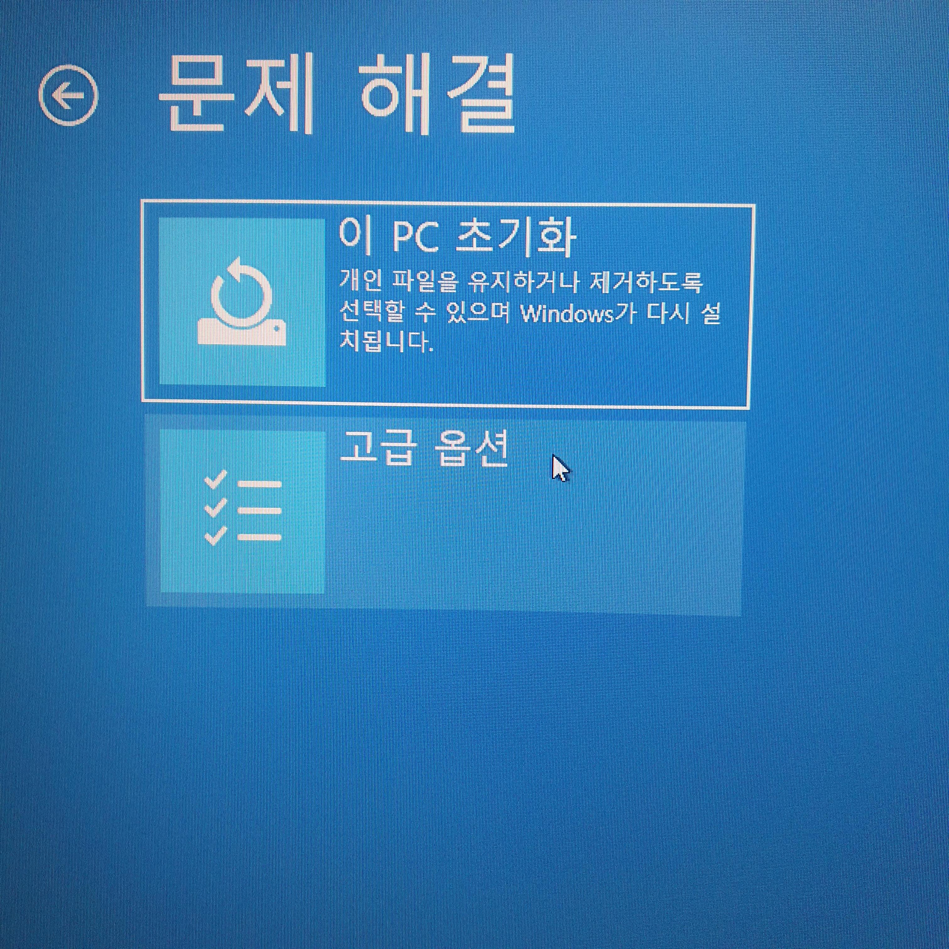 먼저 캡처된 사진이 아닌 카메라로 찍어 화질이 안좋다는 점 사과드리겠습니다. 일단 shift + 다시시작을 누르시면 다음과 같이 옵션선택을 하실 수 있습니다. 여기서 순서는 현재 마우스가 가있는 곳의 문제해결을 누르신 후 고급 옵션을 눌러주시면 됩니다.