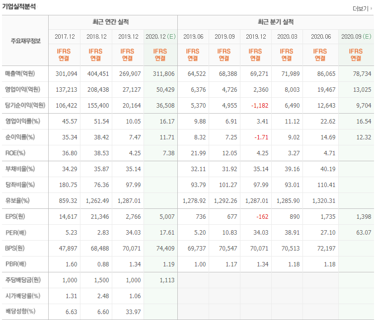 단순하게 봤을 때 EPS는 2020. 6. 반기 기준으로 1,735원으로 2016년부터 갈수록 낮아지고 있습니다. EPS도 주가에 따라 마구 변동되기 때문에 섣불리 판단할 수는 없지만 보통 3년이상 EPS가 높아지면 찜을 하는 필자로서는 아쉬운 부분입니다.
