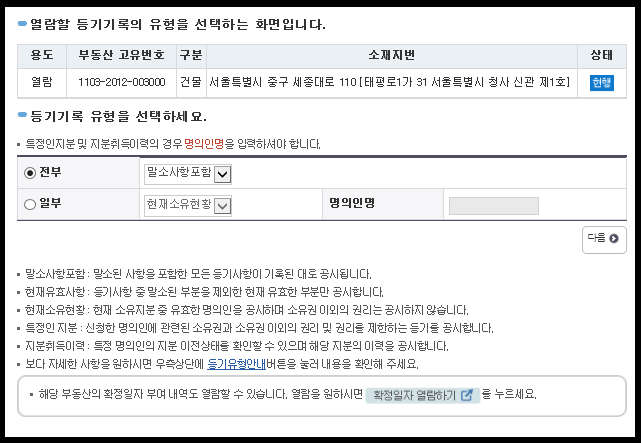 선택 후에는 등기기록 유형을 선택할 수 있는 말소사항포함, 유효사항으로 나눠 검색할 수 있습니다.