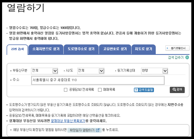 저는 서울시청의 주소를 입력했습니다. 주소 입력창 위에 부동산 구분은 전체, 집합건물, 토지, 건물로 나눠져 있으니 필요한 부분만 보고 싶다고 하시면 원하는 것만 선택하여 검색하시면 됩니다.