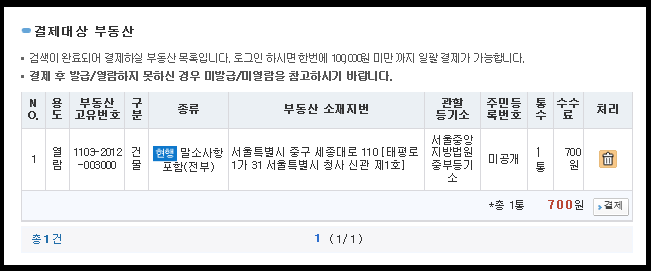 모든게 완료되었다면 다음과 같이 결제대상 부동산에 본인이 검색하신 등기부등본이 출력됩니다.