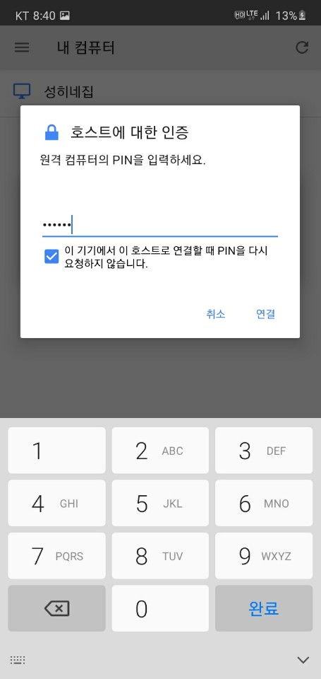 다운로드 받은 앱을 실행시키면 아까 데스크톱에서 설정한 이름이 나옵니다. 터치하게 되면 호스트에 대한 인증이 나오는데 아까 데스크톱에서 설정한 비밀번호를 입력해주시면 됩니다.