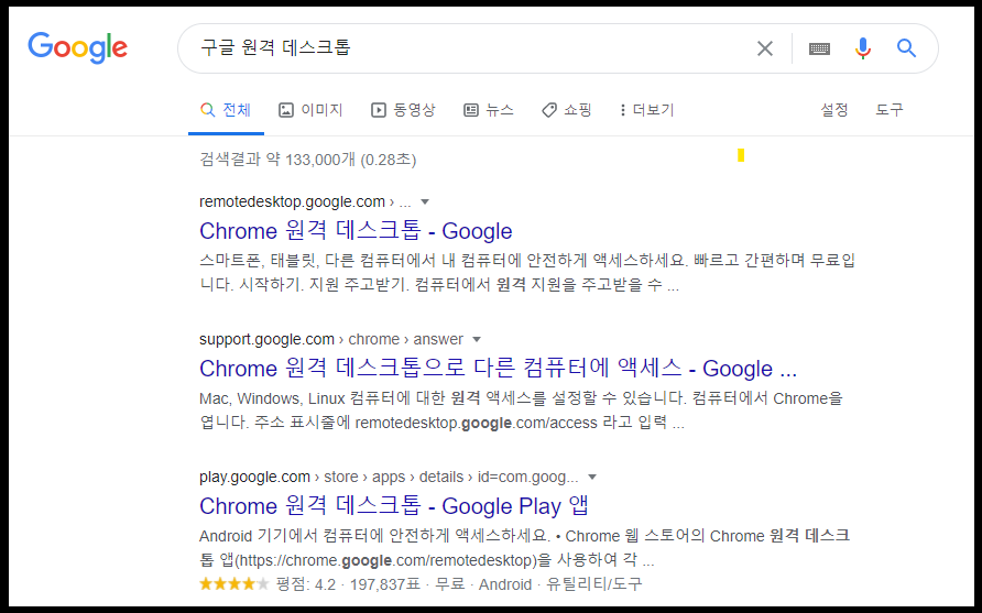 먼저 구글 검색창에 "크롬 원격 데스크톱"을 검색합니다. 가장 위에 있는 링크를 클릭해줍니다.