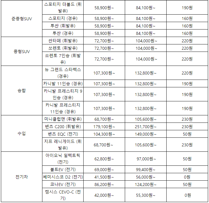 일단 기본적으로 주중과 주말, 그리고 시간에 따라 가격이 달라집니다. 또한, 차종별로 일일대여요금과 주행요금이 모두 다르게 책정됩니다.