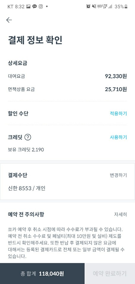 주말 합계 요금은 118,040원으로 어마어마한 요금이 부과됩니다. 이럴꺼면 차라리 렌트카를 빌리는 게 더 나을수도 있겠습니다만!