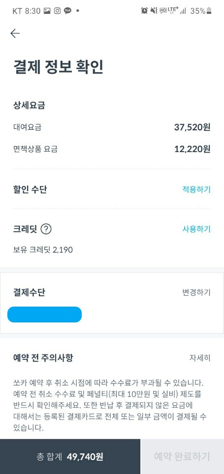 차량손해면책금(보험료)은 제일 높은 5만원짜리 요금으로 설정했습니다. 어떠한 할인을 받지 않았을 때 요금은 49,740원입니다.