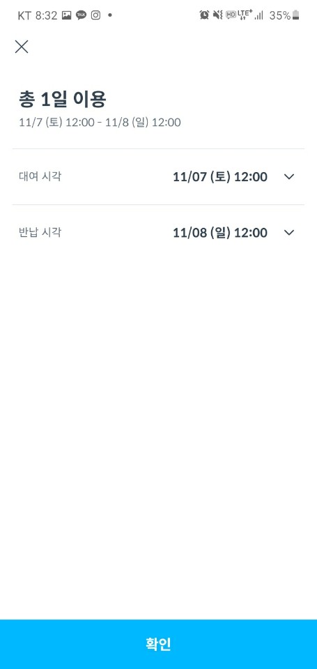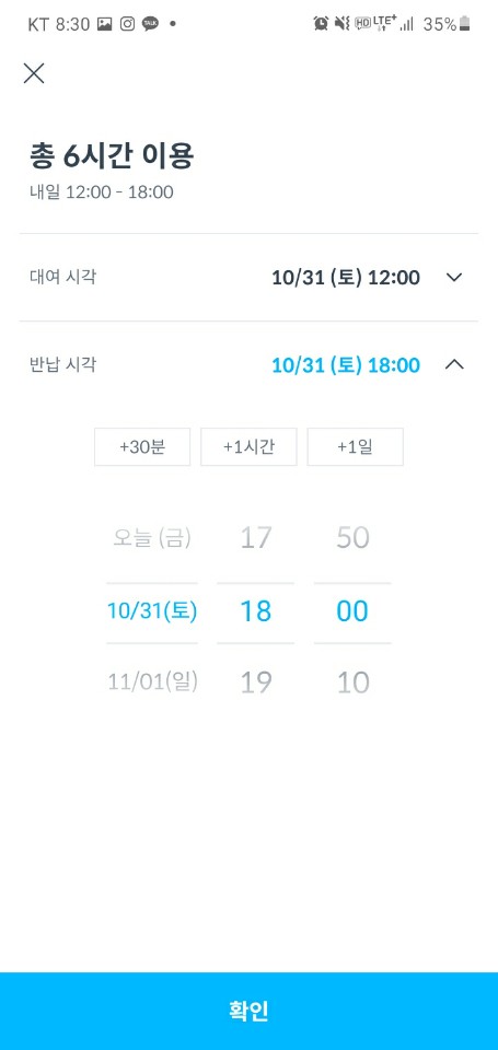 먼저 평일인 11월 2일 월요일 12:00 - 18:00 6시간 대여 요금입니다.