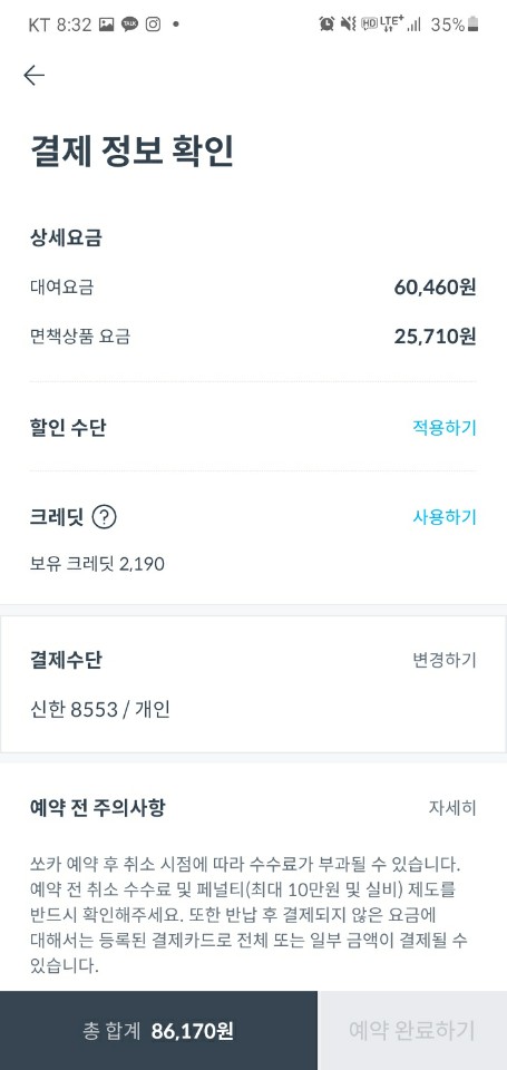 모든 조건은 쏘카 평일 6시간 대여와 동일하게 설정했습니다.